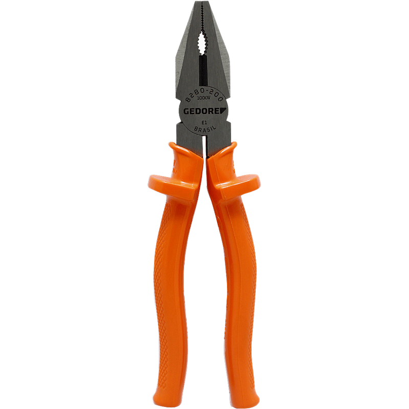 Corpo em aço Gedore-Vanadium e empunhadura em polímero anti-chamas na cor laranja padrão Gedore. Acabamento escurecido e faces lixadas. Empunhadura ergonômica e antideslizante, com abas protetoras arredondadas para maior conforto e segurança. Produzida por injeção, propiciando isolação até 1000 V, conforme norma NBR 9699, submetida à ensaios de: impacto, tensão elétrica, aderência, inflamabilidade e pressão/penetração. Utilizar este Alicate isolado, em tensão máxima de 1000 V em corrente alternada e 1500 V em corrente contínua, conforme norma NBR 9699. Atende com segurança a norma regulamentadora NR 10 - Segurança em Instalações e Serviços em Eletricidade, possui certificado de isolação. Tratamento térmico total e corte temperado por indução com dureza de 62 - 65 HRC. Fornecido em embalagem autoserviço.