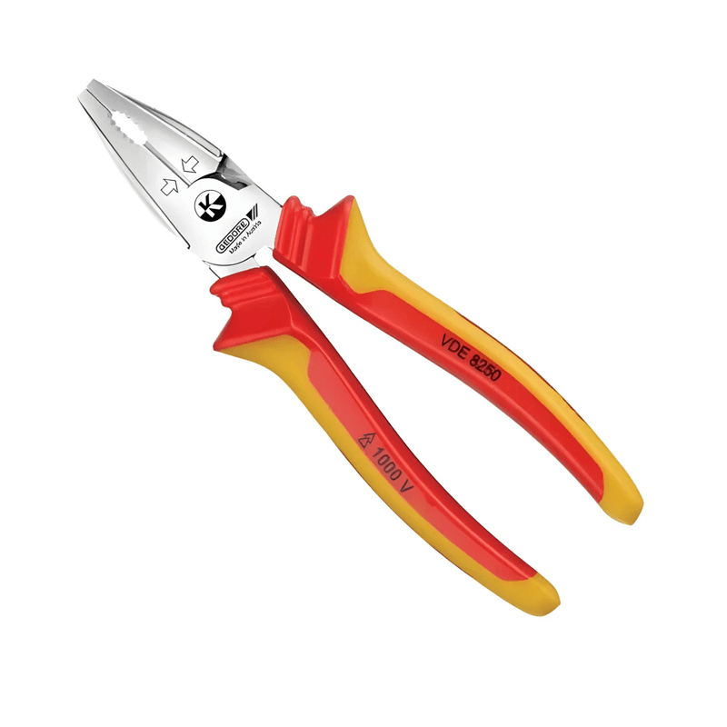 O Alicate Universal Kraft 8" 1000V VDE 8250-200H 091896 Gedore combina segurança, resistência e ergonomia para trabalhos elétricos. Fabricado em aço Gedore-Vanadium com empunhadura anti-chamas, a 091896 oferece isolamento de até 1000V C.A. e 1500V C.C., atendendo à NR 10 e normas internacionais. Seu sistema Kraft Power Pliers permite cortes com até 35% menos esforço, enquanto seu design ergonômico da 091896 garante conforto e segurança, sendo ideal para cortar, puxar, segurar e dobrar fios com alta eficiência e durabilidade.