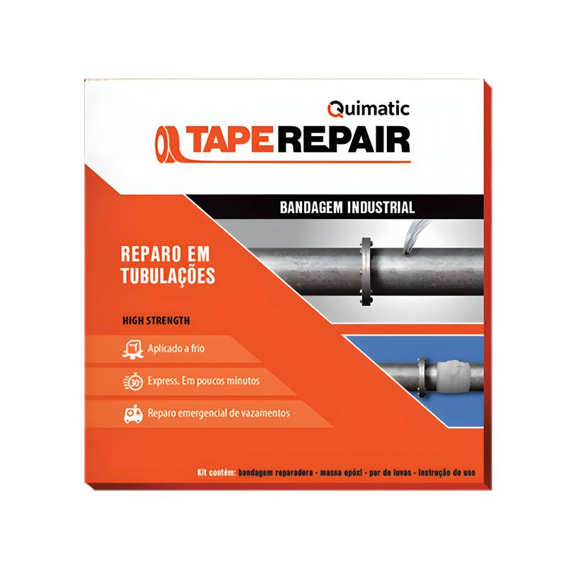 TAPEREPAIR® é composto por uma bandagem impregnada com resina polimérica hidroativa, massa epóxi na forma de tubete, par de luvas e manual de instrução;