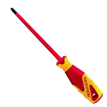 Aço Molibdênio-Vanadium-Plus e polímero anti-chamas, nas cores vermelho e amarelo, padrão Gedore. Acabamento escurecido. Com revestimento produzido por injeção, propiciando isolação até 1000 V, conforme norma EN 60900 / IEC 60900, submetida à ensaios de: impacto, tensão elétrica, aderência, inflamabilidade e pressão/penetração. Utilizar ferramentas isoladas VDE, em tensão máxima de 1000 V em corrente alternada e 1500 V em corrente contínua, conforme norma EN 60900 / IEC 60900. Atende com segurança a norma regulamentadora NR 10 - Segurança em Instalações e Serviços em Eletricidade, possui certificado de isolação. Empunhadura ergonômica em 3 componentes Power-Grip 3, que permite ao operador a execução do trabalho preciso e sem fadiga, devido ao ajuste positivo da empunhadura e lâmina para transmissão de força adequada. Encaixe identificado no final da empunhadura. Chave com haste redonda e resistente, com perfil de encaixe para parafusos tipo fenda cruzada “Phillips".