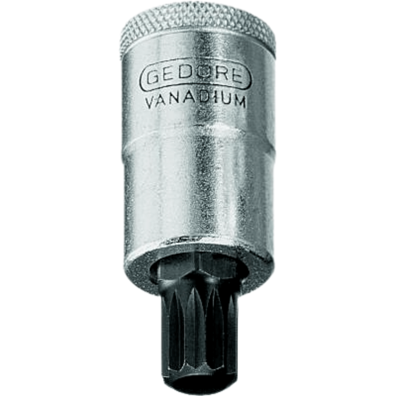 Aço Gedore-Vanadium. Soquete com acabamento niquelado e cromado/ zincado, com ponteira escurecida. Para trabalhar com acessórios manuais com encaixe quadrado 12,7 mm (1/2”), conforme DIN 3120 - C 12.5, ISO 1174. Perfil dodecagonal externo, para parafusos especiais INBUS® XZN interno.
