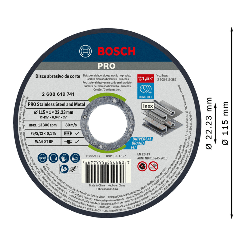 Os Discos de Corte PRO Stainless Steel and Metal efetuam cortes em alta velocidade além de proporcionar um grande rendimento, com cada disco sendo capaz de executar diversos cortes em aço inoxidável até o fim de sua vida útil. São produzidos com grãos abrasivos de óxido de alumínio de alta qualidade e alta dureza, com aditivos que reduzem o calor gerado durante o corte, além de telas de fibra de vidro feitas com precisão e simetria que trazem grande estabilidade para os discos. Dessa forma os discos são capazes de efetuar cortes com menos rebarbas e possuem longa durabilidade. Em sua formulação não possuem ferro, cloro e enxofre o que evita a contaminação dos materiais a serem trabalhados. São fabricados sob alto padrão de qualidade em conformidade com as normas internacionais (EN 12413) e possuem certificações de qualidade como ABNT (Brasil) e OSA (Europa) trazendo máxima segurança durante sua aplicação. São indicados para corte de aço e aço inoxidável e utilização em esmerilhadeiras manuais. Possui até 1,5x mais vida útil que o Disco de Corte Bosch 2608619383. Garantia Bosch 6 meses.