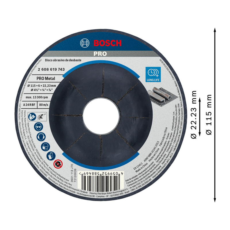 Os Discos de Desbaste PRO Metal efetuam desbaste em alta velocidade além de proporcionar um grande rendimento, com cada disco sendo capaz de executar diversos desbastes em metal até o fim de sua vida útil. São produzidos com grãos abrasivos de óxido de alumínio de alta qualidade e telas de fibra de vidro feitas com precisão e simetria que trazem alta estabilidade para os discos. São fabricados sob alto padrão de qualidade em conformidade com as normas internacionais (EN 12413) e possuem certificações de qualidade como ABNT (Brasil) e OSA (Europa) trazendo máxima segurança durante sua aplicação. São indicados para desbaste de aço e utilização em esmerilhadeiras manuais. Garantia 6 meses Bosch.