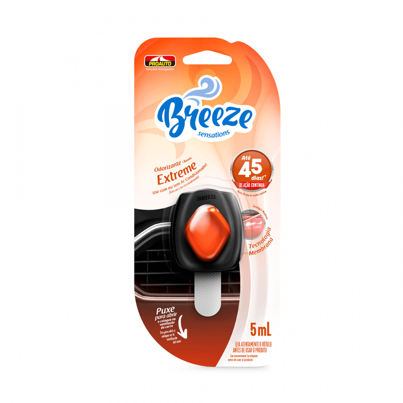 Breeze Sensations é um odorizante para autos. Combinando qualidade, praticidade, moderna tecnologia e as mais deliciosas fragrâncias, a Proauto desenvolveu um odorizante com um inovador sistema de membrana. Essa tecnologia proporciona ação duradoura de forma regular e controlada por todo o ambiente. Além disso, Breeze Sensations não quebra, não derrama e não precisa do ar condicionado.