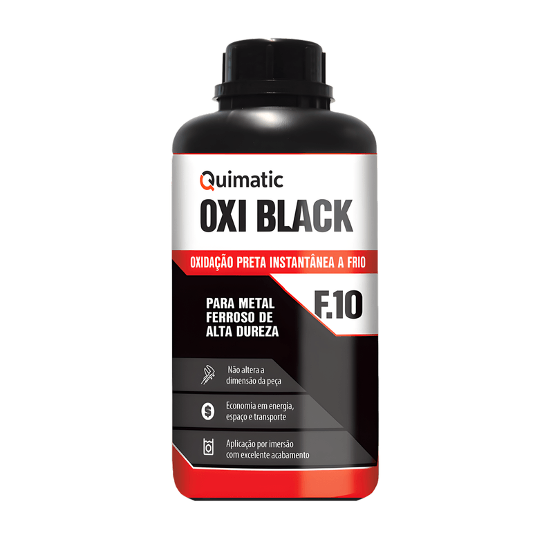 - O Oxi Black F10 - 1 Litro Quimaticé um sistema de oxidação negra que proporciona acabamento durável, consistente e uniforme, sem provocar qualquer alteração dimensional ou estrutural nas peças tratadas. Seu processo é realizado a frio, garantindo economia de energia e simplicidade na aplicação, além de agregar valor estético ao produto final.