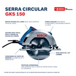 A Serra Circular Bosch GKS 150, com 1500W de potência, é ideal para as principais aplicações e com um preço que cabe no seu bolso. Conta com recurso contra travamento para maior segurança, além de punho auxiliar robusto que garante maior estabilidade durante o corte. O pó fica longe do usuário graças a sua saída de pó eficiente. As escovas de carvão são facilmente acessadas, fazendo com que sua troca seja simples e fácil; Agora com 1500 W e o melhor preço. Potência ideal para as principais aplicações; - Recurso contra travamento garante maior proteção ao usuário; - Robusto punho auxiliar para maior estabilidade durante o corte; - Eficiente saída de pó para longe do usuário; - Uso profissional com 1 ano de garantia. Características: - Bosch Professional; - Bucha; - Não possui velocidade variável; - Acabamento da ferramenta: Poliamida, metal e elastômero; - Acabamento do cabo: Borracha, cobre; - Comprimento do cabo (m): 2; - Tipo de embalagem: Caixa de papelão; - Público Alvo: Carpinteiros, pedreiros, empreiteiros, construções civis, telhadistas, instaladores em geral, vidraceiros, oficinas de manutenção, fabricantes e instaladores de decks e pergolados, marceneiros;
