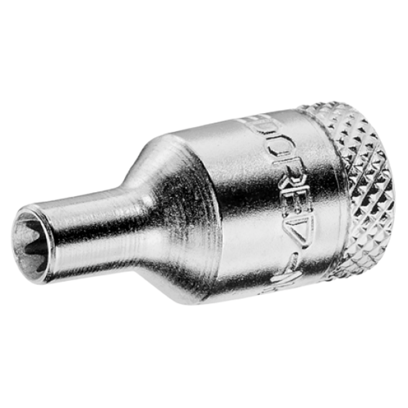 Aço Gedore-Vanadium. Acabamento niquelado, cromado e polido. Para trabalhar com acessórios manuais com encaixe quadrado 6,35 mm (1/4”), conforme DIN 3120 - C 6.3, ISO 1174, com sistema de retenção por esferas. Indicado para parafusos com geometria GTX (perfil hexalobular) externo.